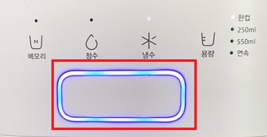 아래와 같이 정수기 출수 버튼에 불빛이 꺼지게 되면 출수 버튼 누르는 것을 중지하시면 됩니다.